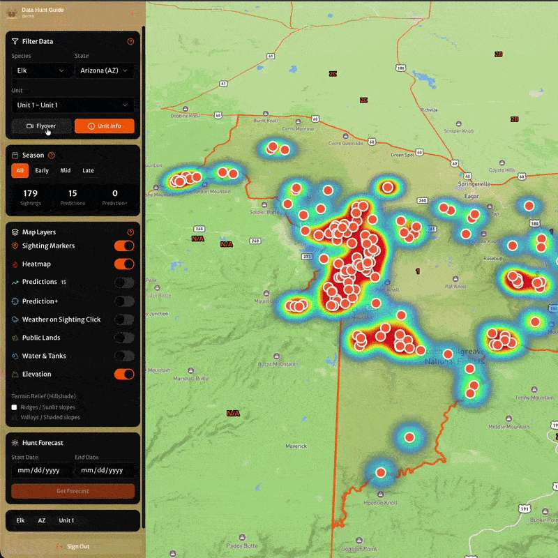 Data Hunt Guide shows you high-probability hunting locations inside your specific unit using thousands of real deer, elk, and game sightings.